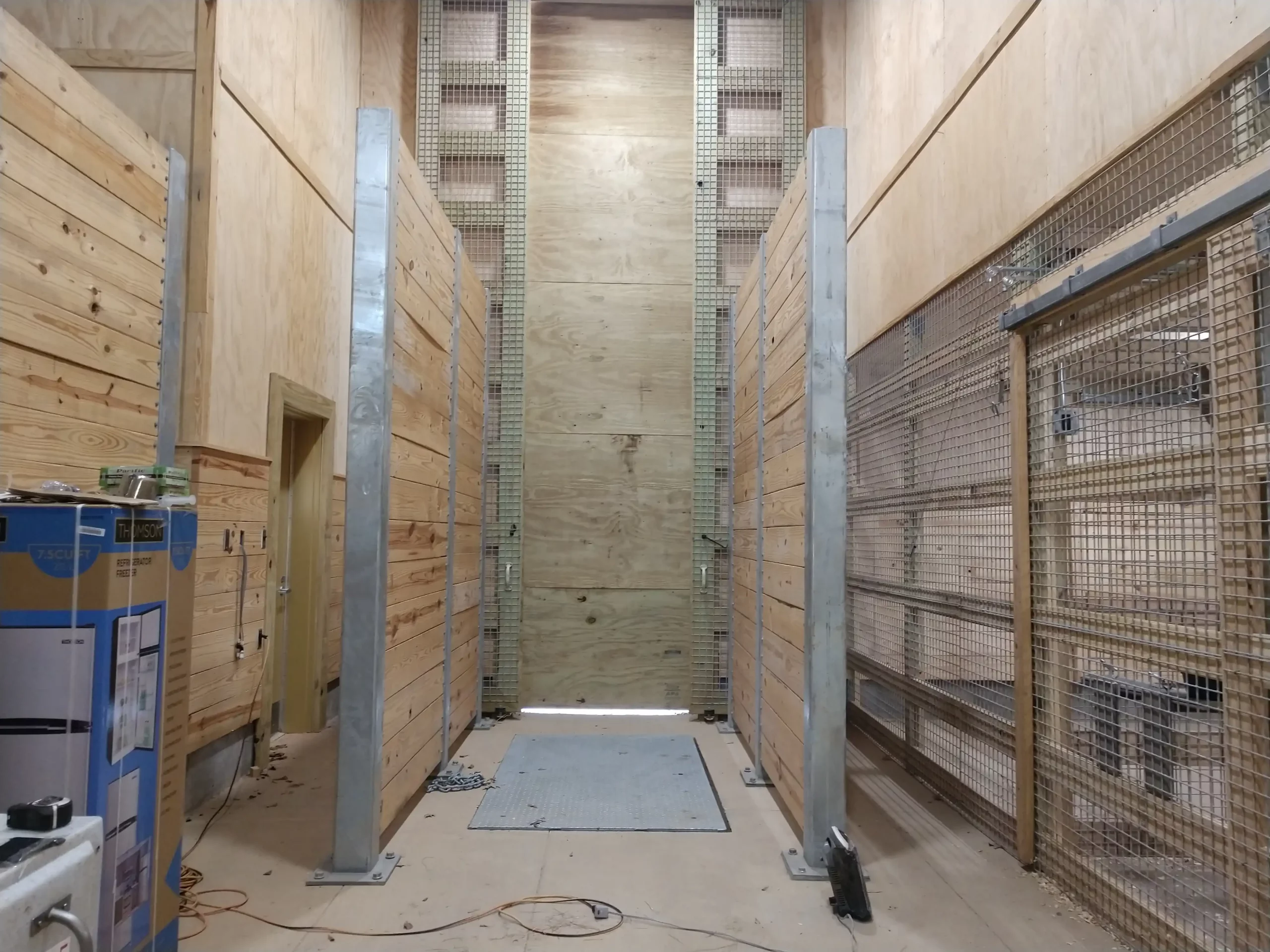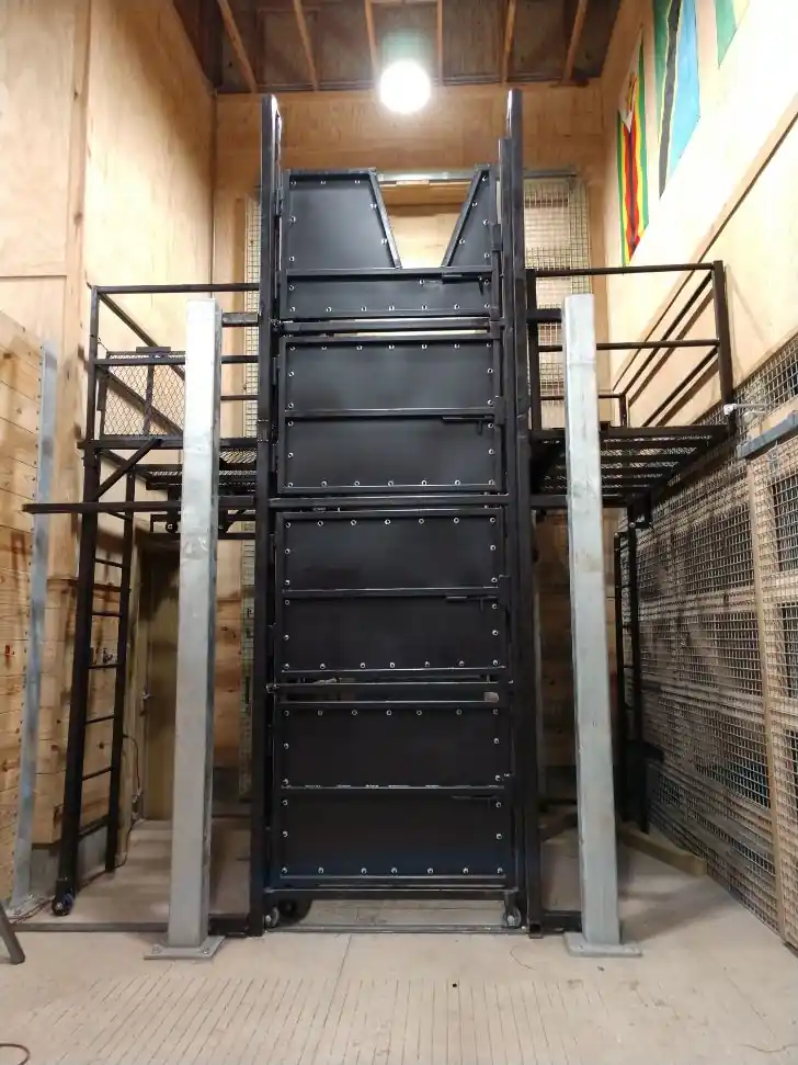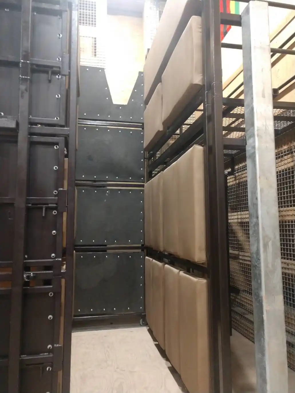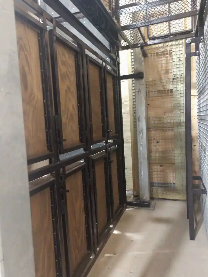 While our squeeze chute is customizable for each customer’s site and preferred design, our standard giraffe restraint device is fully featured. It includes digital scales and allows full body access to each giraffe through the use of 30 access doors. Each side has 11 doors and each end gate has 4 doors. One side of the squeeze chute pushes in to safely restrain the giraffe. To promote safety, forward motion into the chute, and decreased stress while standing inside, the squeeze chute does not have any overhead steel supports that a giraffe would have to pass under. With our restraining device it is possible to perform x-rays, ultrasounds, injections, vaccinations, tissue samples, blood draws, hoof trimming, newborn delivery, rectal palpation, cervical catheterization, etc from a safe and protected position.