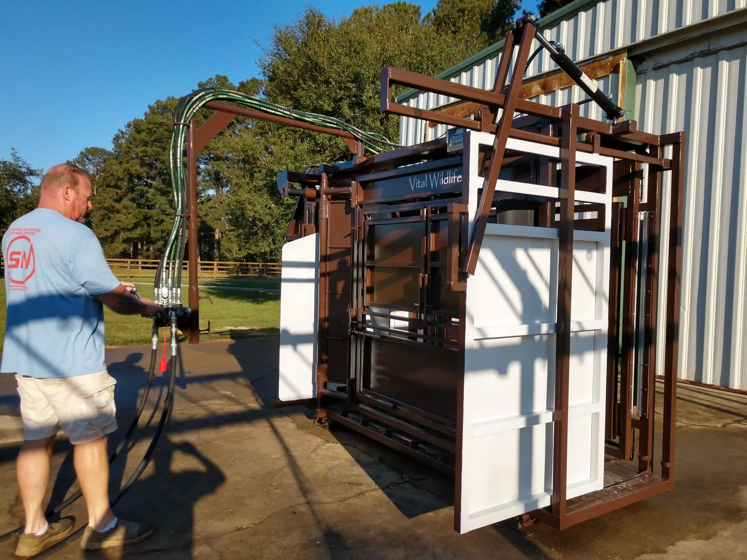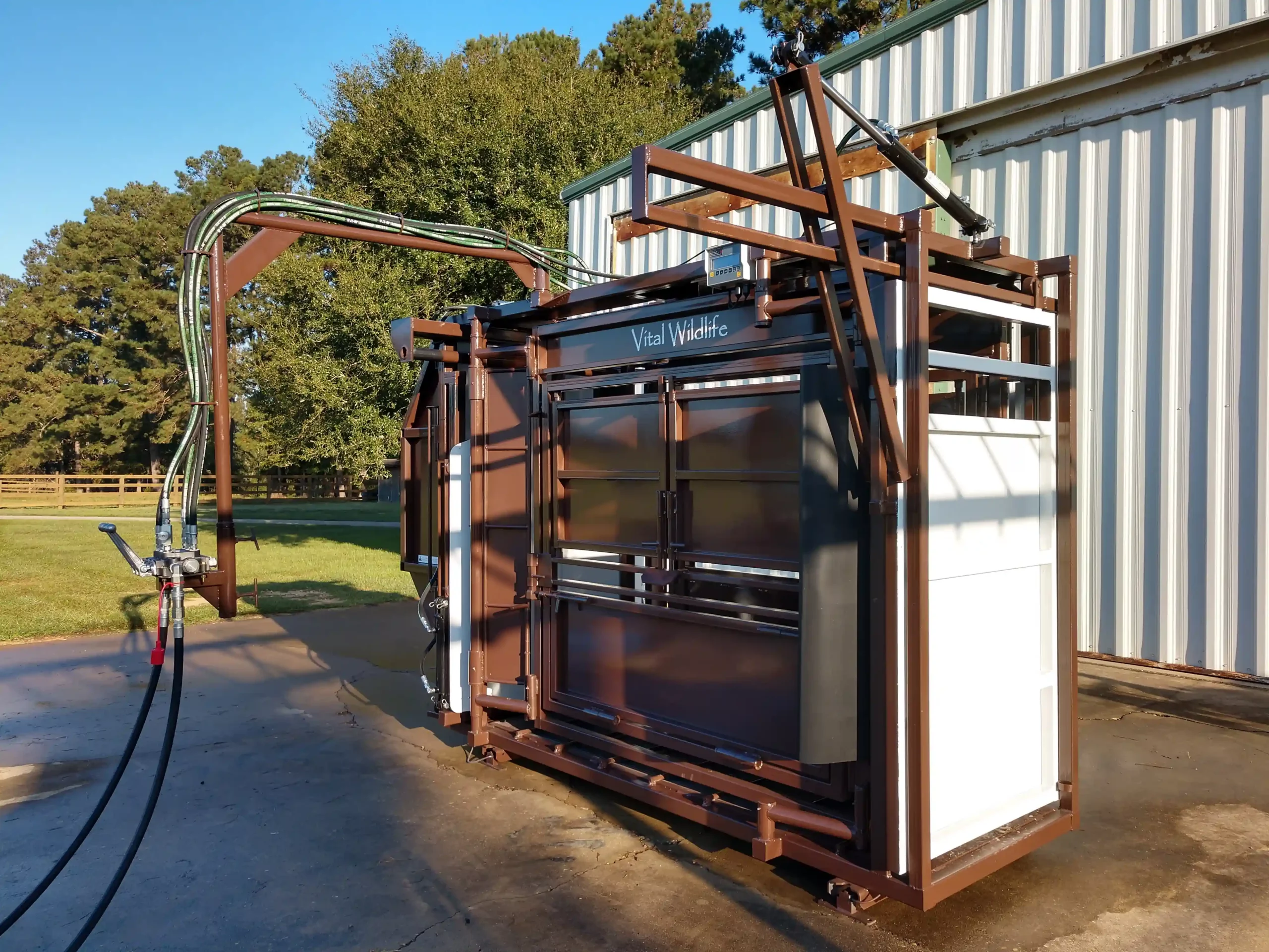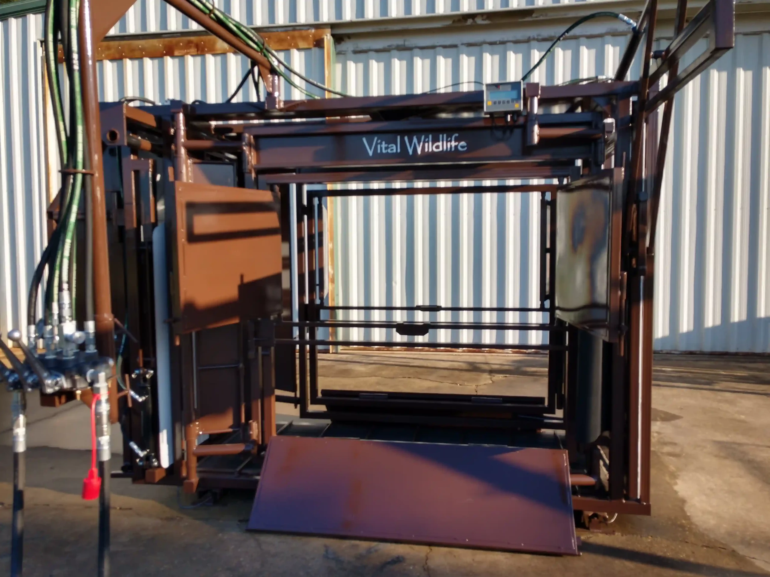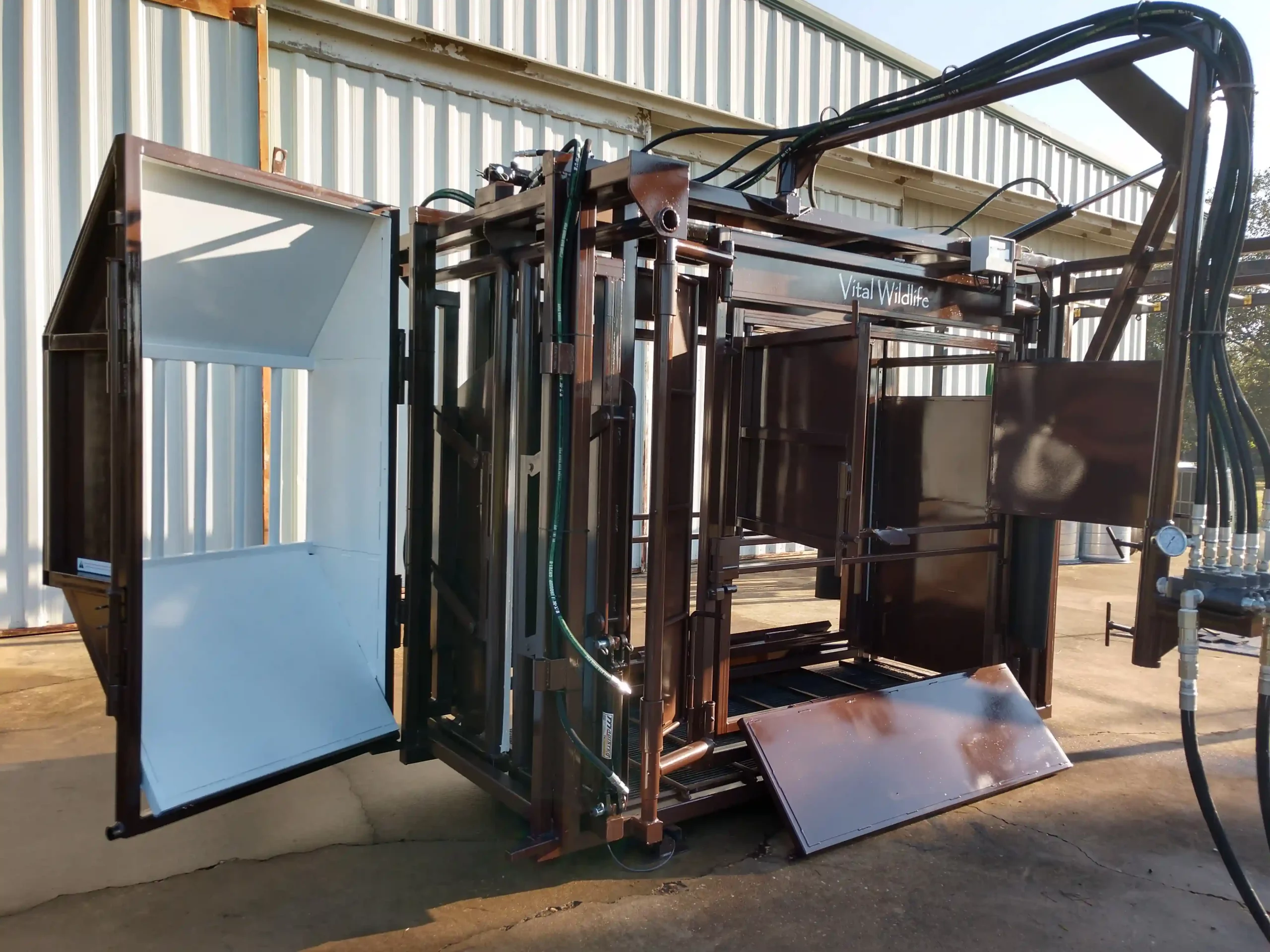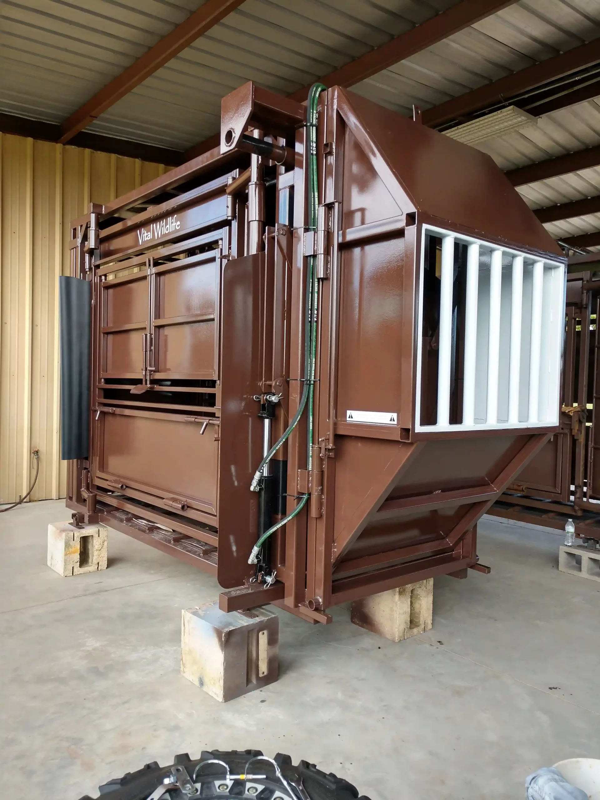 Vital’s colors are brown and white for a specific reason: bison have dichromatic vision, and do not see colors the same as humans. We paint our bison chutes, pre-alleys, and entire handling facilities brown with strategic placement of bright white to facilitate the forward movement desired. As a result, bison move forward through the handling facility and the squeeze chute with less effort and less stress. The smooth sided and fully sheeted interior acts to reduce separation anxiety, fear of close contact with humans, and rearing to escape. Rumber flooring and quiet access doors further contribute to reducing the stress bison experience while in the chute. The overall design and function of the squeeze chute allows bison to relax once inside, which decreases physical trauma to the bison and wear and tear on the chute.